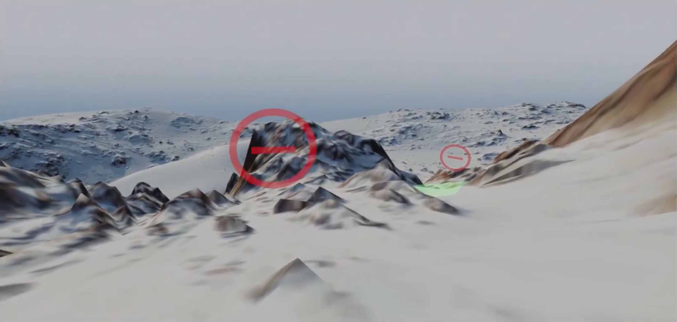 3-D-model of a mountain landscape with annotations (global view, guide view, skier view)