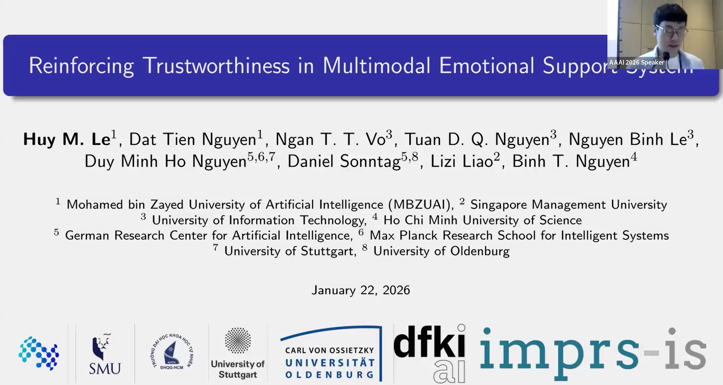 Huy Le presenting the paper “Reinforce Trustworthiness in Multimodal Emotional Support System” at the AAAI conference